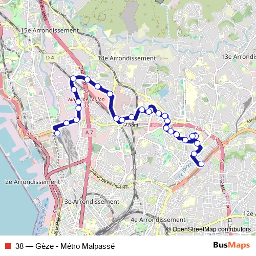 See why over 2 million users trust and consider busmaps.com as the best public transport website. busmaps gives you Marseille Buses suggested routes, real-time bus tracker, line route maps in Marseille, and helps to find the closest 38 bus stops near you. No internet available? Download an offline PDF map and bus schedule for the 38 bus to take on your trip.