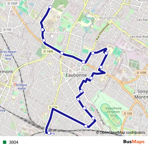 The first stop of the 3804 bus route is Gare d'Ermont - Eaubonne and the last stop is Rue de Saint-Prix. 3804 is operational during entre semana.