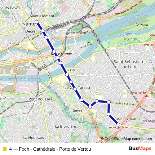 See why over 2 million users trust and consider busmaps.com as the best public transport website. busmaps gives you Nantes Buses suggested routes, real-time bus tracker, line route maps in Nantes, and helps to find the closest 4 bus stops near you. No internet available? Download an offline PDF map and bus schedule for the 4 bus to take on your trip.