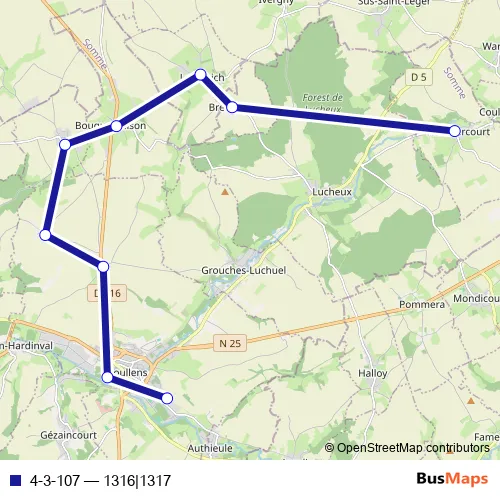 The first stop of the 4-3-107 bus route is Humbercourt - Place and the last stop is Doullens - Lycée de l'Authie. 4-3-107 (1316|1317) is operational during todos los días.