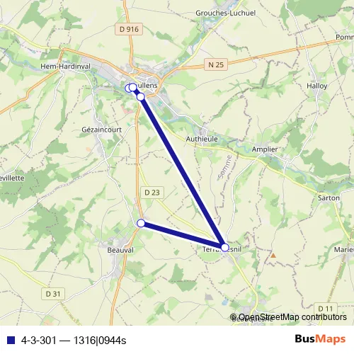The first stop of the 4-3-301 bus route is Doullens - Collège Jean Rostand and the last stop is Beauval - Saint Frères. 4-3-301 (1316|0944s) is operational during todos los días.