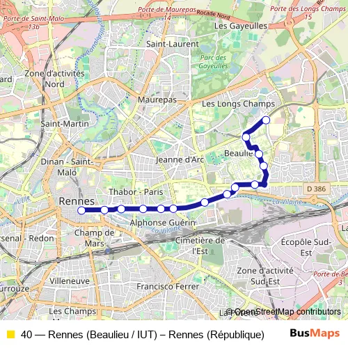See why over 2 million users trust and consider busmaps.com as the best public transport website. busmaps gives you Rennes Buses suggested routes, real-time bus tracker, line route maps in Rennes, and helps to find the closest 40 bus stops near you. No internet available? Download an offline PDF map and bus schedule for the 40 bus to take on your trip.