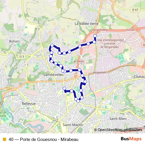 The first stop of the 40 bus route is Mirabeau and the last stop is Porte de Gouesnou. 40 (Porte de Gouesnou - Mirabeau) is operational during entre semana.