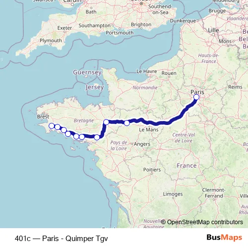 The first stop of the 401c rail route is Quimper and the last stop is Paris Montparnasse Hall 1 - 2. 401c (Paris - Quimper Tgv) is operational during todos los días.