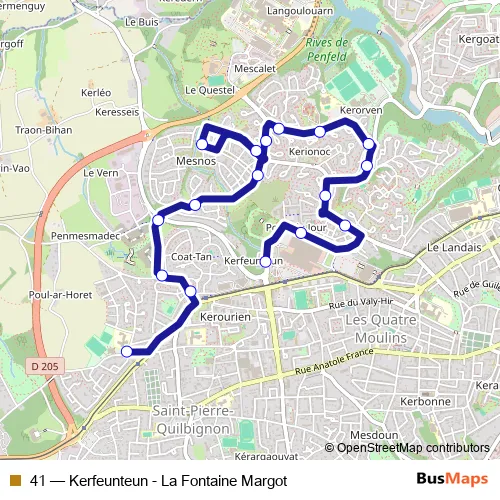 The first stop of the 41 bus route is Fontaine Margot and the last stop is Kerfeunteun. 41 (Kerfeunteun - La Fontaine Margot) is operational during entre semana.