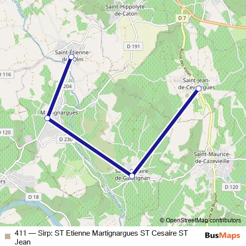 See why over 2 million users trust and consider busmaps.com as the best public transport website. busmaps gives you Saint-Maurice-de-Cazevieille Buses suggested routes, real-time bus tracker, line route maps in Saint-Maurice-de-Cazevieille, and helps to find the closest 411 bus stops near you. No internet available? Download an offline PDF map and bus schedule for the 411 bus to take on your trip.