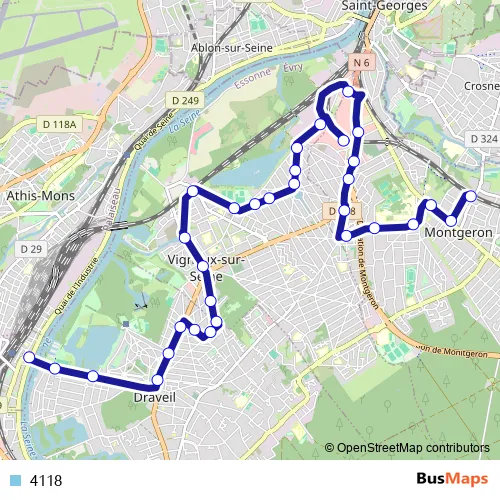 The first stop of the 4118 bus route is Gare de Montgeron - Crosne and the last stop is Juvisy Gare Routière Seine. 4118 is operational during todos los días.