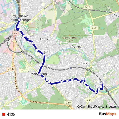 The first stop of the 4135 bus route is Gare de Villeneuve and the last stop is Gare de Brunoy. 4135 is operational during todos los días.