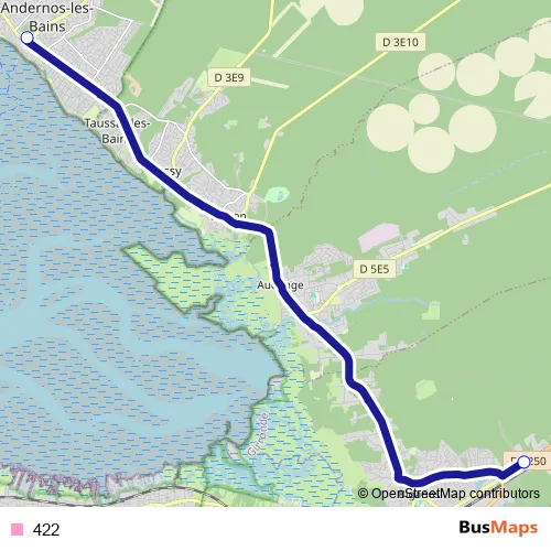 The first stop of the 422 bus route is Lacanau DE Mios - Garenne de Délis and the last stop is Ninèche. 422 is operational during todos los días.