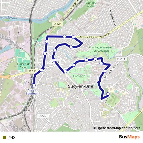 The first stop of the 443 bus route is Collège du Fort and the last stop is Gare de Sucy-Bonneuil. 443 is operational during entre semana.