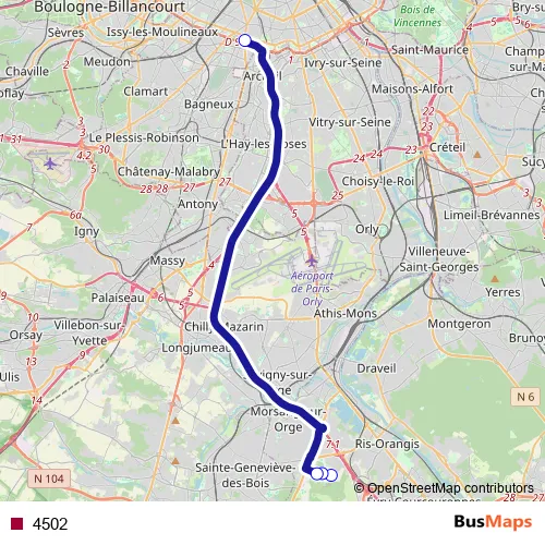 The first stop of the 4502 bus route is Maison d'Arrêt des Femmes and the last stop is Porte d'Orléans. 4502 is operational during todos los días.