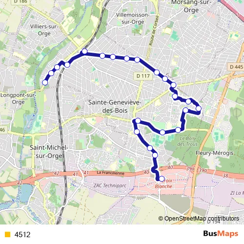 The first stop of the 4512 bus route is Gare de Sainte-Geneviève-des-Bois and the last stop is ZI Croix Blanche. 4512 is operational during todos los días.