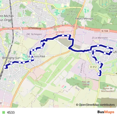 The first stop of the 4533 bus route is Imprimerie Nationale and the last stop is Gare de Brétigny Place. 4533 is operational during todos los días.