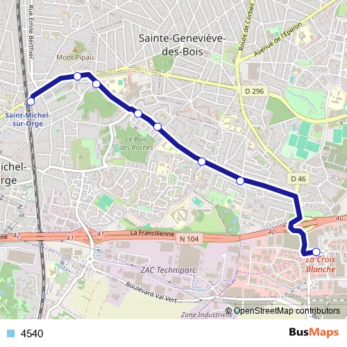 The first stop of the 4540 bus route is Gare de Saint-Michel-sur-Orge and the last stop is Place Hausen. 4540 is operational during todos los días.