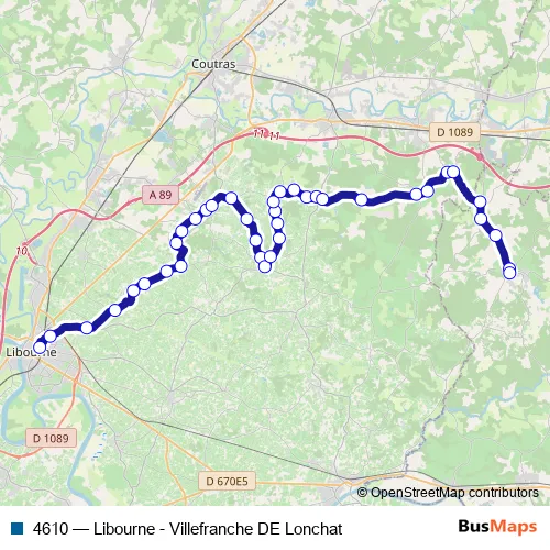 The first stop of the 4610 bus route is Gare Routiere and the last stop is Bourg. 4610 (Libourne - Villefranche DE Lonchat) is operational during entre semana.
