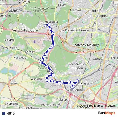 The first stop of the 4615 bus route is Gare de Massy-Palaiseau Vilmorin and the last stop is Vélizy 2. 4615 is operational during todos los días.
