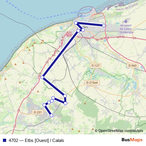 The first stop of the 4702 bus route is Calais - Coubertin - Bd 8 Mai and the last stop is Ferques - Place Elinghen - N°37. 4702 (Etbs [Ouest] / Calais) is operational during todos los días.