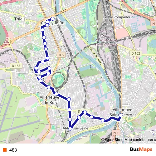 The first stop of the 483 bus route is Gare de Villeneuve-Saint-Georges and the last stop is Gare de Choisy-le-Roi. 483 is operational during todos los días.