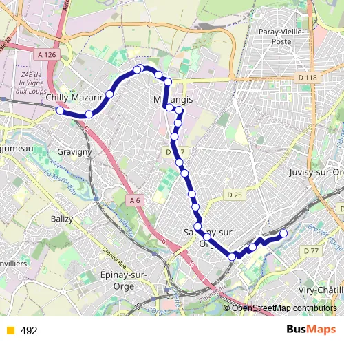 The first stop of the 492 bus route is Prés Saint-Martin and the last stop is Gare de Chilly-Mazarin. 492 is operational during todos los días.