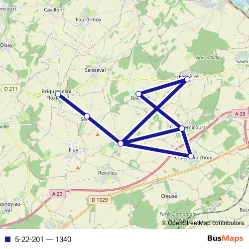 The first stop of the 5-22-201 bus route is Ferrieres - Ecole and the last stop is Pissy - Cantine. 5-22-201 (1340) is operational during todos los días.