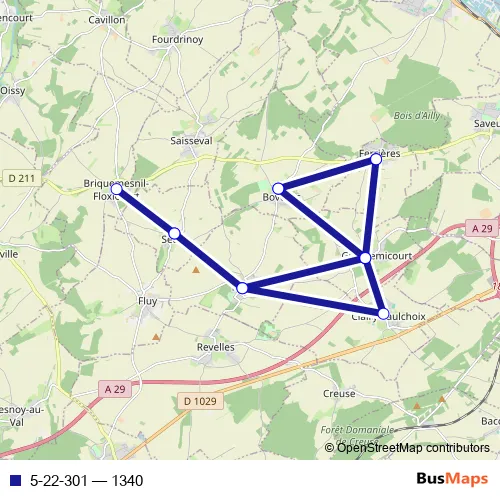 The first stop of the 5-22-301 bus route is Ferrieres - Ecole and the last stop is Guignemicourt - Ecole. 5-22-301 (1340) is operational during todos los días.