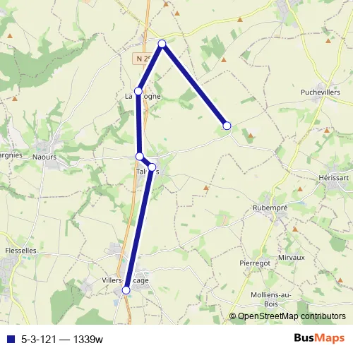 The first stop of the 5-3-121 bus route is Talmas - Le Val de Maison and the last stop is Villers-Bocage - Collège les Coudriers. 5-3-121 (1339w) is operational during todos los días.