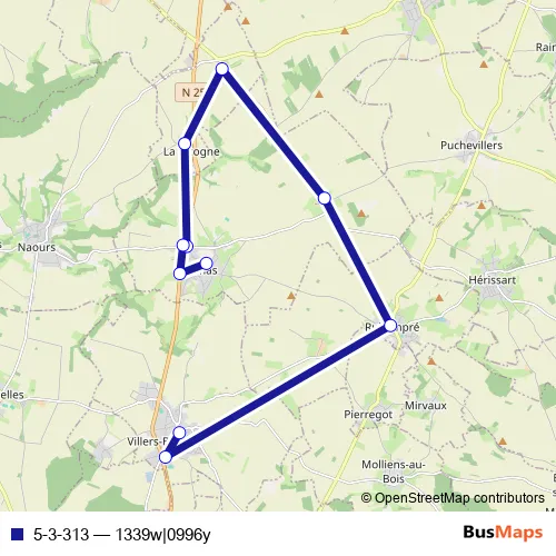 The first stop of the 5-3-313 bus route is Villers-Bocage - Ecole and the last stop is Talmas - Mare de la Ville. 5-3-313 (1339w|0996y) is operational during todos los días.