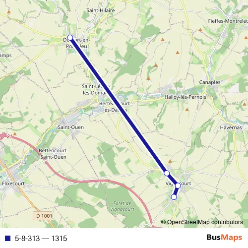 The first stop of the 5-8-313 bus route is Domart-EN-Ponthieu - Collège Val de Nièvre and the last stop is Vignacourt - Sortie de village. 5-8-313 (1315) is operational during todos los días.
