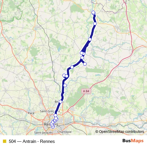 The first stop of the 504 bus route is Gare Routière and the last stop is Antrain Bourg. 504 (Antrain - Rennes) is operational during todos los días.