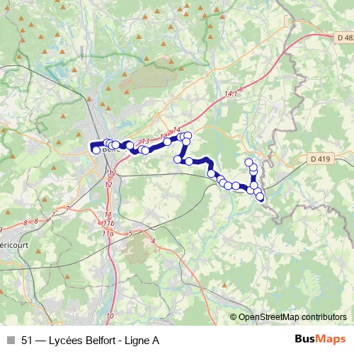 See why over 2 million users trust and consider busmaps.com as the best public transport website. busmaps gives you Belfort Buses suggested routes, real-time bus tracker, line route maps in Belfort, and helps to find the closest 51 bus stops near you. No internet available? Download an offline PDF map and bus schedule for the 51 bus to take on your trip.
