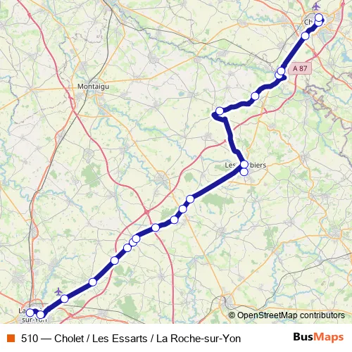 The first stop of the 510 bus route is PEM-Sncf and the last stop is Gare Routière. 510 (Cholet / Les Essarts / La Roche-sur-Yon) is operational during todos los días.