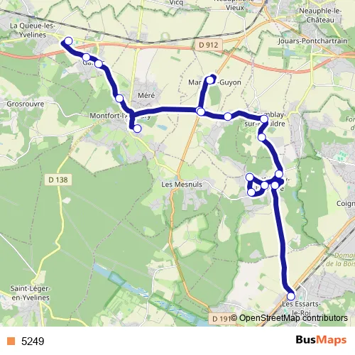 The first stop of the 5249 bus route is Lycée Jean Monnet and the last stop is Gare des Essarts-le-Roi. 5249 is operational during entre semana.