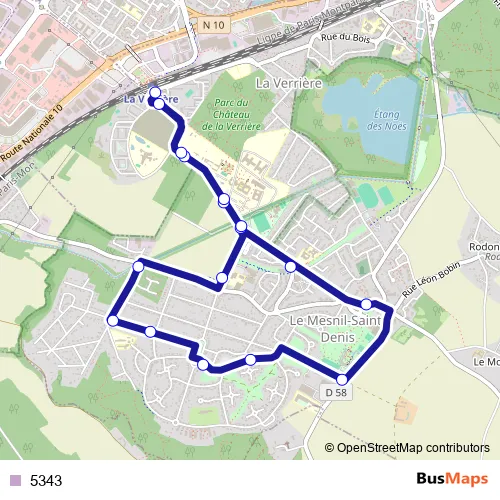 The first stop of the 5343 bus route is Gare de la Verrière and the last stop is Gare de la Verrière. 5343 is operational during entre semana.