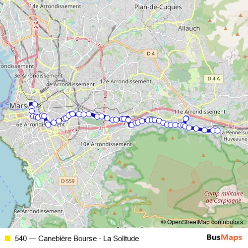 The first stop of the 540 bus route is Canebière Bourse and the last stop is La Solitude. 540 (Canebière Bourse - La Solitude) is operational during todos los días.