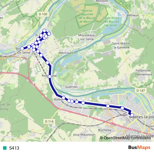 The first stop of the 5413 bus route is Bonnières-sur Seine Gare Routière - Quai 1 and the last stop is Gare de Mantes-la-Jolie - Quai 2. 5413 is operational during todos los días.