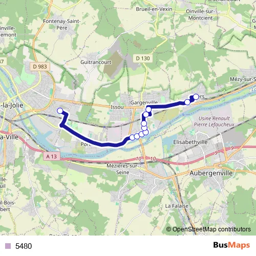 The first stop of the 5480 bus route is Lycée Condorcet - Quai 3 and the last stop is Gare de Juziers. 5480 is operational during entre semana.