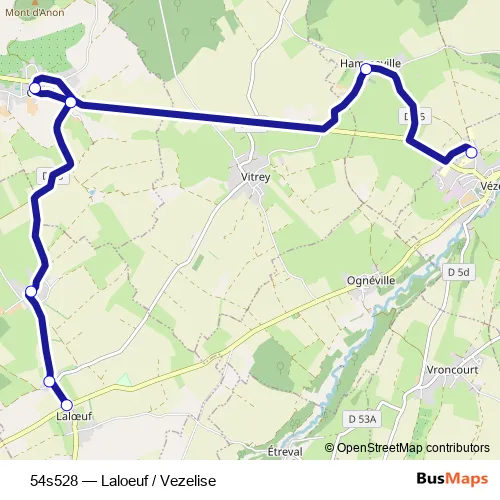 The first stop of the 54s528 bus route is Vezelise - College / Ecole primaire and the last stop is Laloeuf - Velle. 54s528 (Laloeuf / Vezelise) is operational during entre semana.