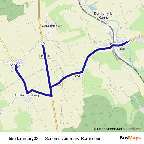 The first stop of the 55edommary02 bus route is Dommary-Baroncourt - Dommary Baroncourt - Groupe Scolaire and the last stop is Senon - Senon. 55edommary02 (Senon / Dommary-Baroncourt) is operational during todos los días.