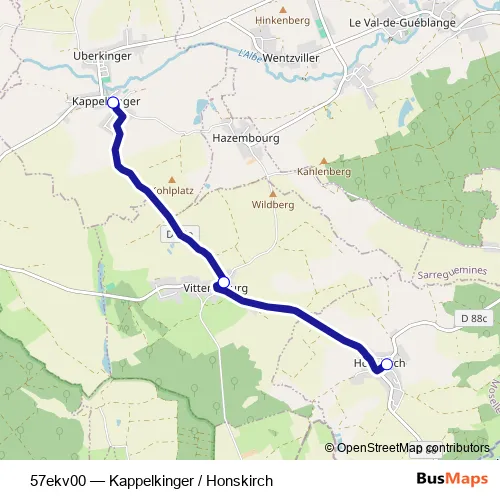 The first stop of the 57ekv00 bus route is Kappelkinger - Ecole and the last stop is Kappelkinger - Ecole. 57ekv00 (Kappelkinger / Honskirch) is operational during todos los días.