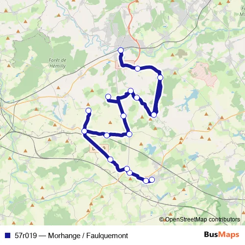 The first stop of the 57r019 bus route is Morhange - Place Du Marche and the last stop is Faulquemont - Place Du Marche. 57r019 (Morhange / Faulquemont) is operational during todos los días.
