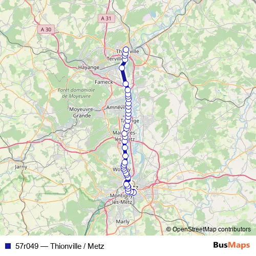 The first stop of the 57r049 bus route is Metz - Gare Routiere and the last stop is Thionville - Foch. 57r049 (Thionville / Metz) is operational during todos los días.