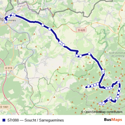 The first stop of the 57r088 bus route is Soucht - Salle Polyvalente and the last stop is Sarreguemines - Gare Routiere. 57r088 (Soucht / Sarreguemines) is operational during entre semana.