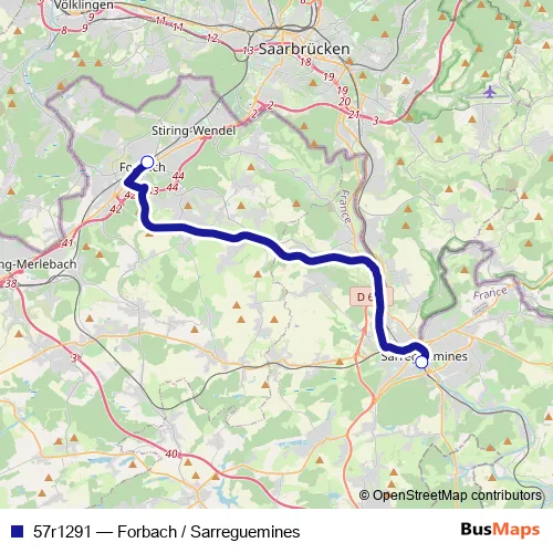 The first stop of the 57r1291 bus route is Forbach - Gare Routiere and the last stop is Sarreguemines - Gare Routiere. 57r1291 (Forbach / Sarreguemines) is operational during entre semana.