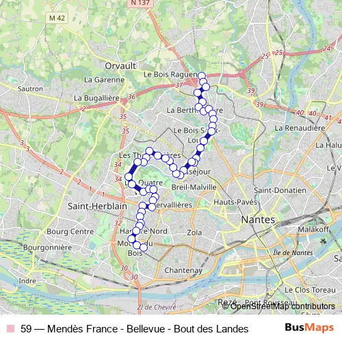 See why over 2 million users trust and consider busmaps.com as the best public transport website. busmaps gives you Nantes Buses suggested routes, real-time bus tracker, line route maps in Nantes, and helps to find the closest 59 bus stops near you. No internet available? Download an offline PDF map and bus schedule for the 59 bus to take on your trip.