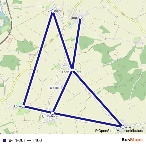 The first stop of the 6-11-201 bus route is Sourdon - Ecole and the last stop is Quiry-LE-SEC - Centre. 6-11-201 (1106) is operational during todos los días.