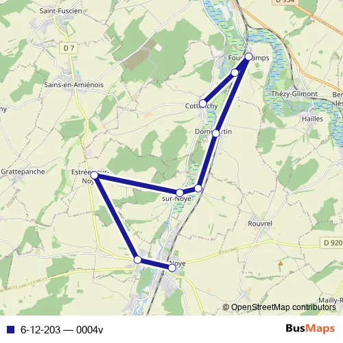 The first stop of the 6-12-203 bus route is Ailly-SUR-Noye - Collège William Henri Classen and the last stop is Cottenchy - Centre - Salle des Fêtes. 6-12-203 (0004v) is operational during todos los días.