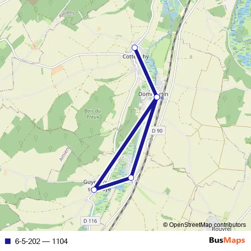 The first stop of the 6-5-202 bus route is Dommartin - Ecole and the last stop is Cottenchy - Ecole - Mairie. 6-5-202 (1104) is operational during todos los días.