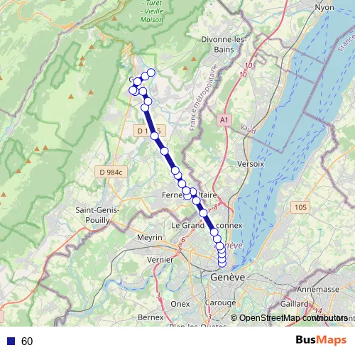 Place de Montbrillant - Rue de Montbrillant - Avenue de France - Avenue Appia - Route de Ferney - Avenue du Jura - Avenue Voltaire - Avenue du Jura - Rue de Genève - Rue de Gex - Route Blanche - Rue Saint-Denis - Rue du Jura - Rue de la Poudrière - Avenue Francis Blanchard - Avenue de la Gare - Avenue des Alpes