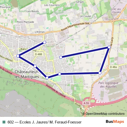 See why over 2 million users trust and consider busmaps.com as the best public transport website. busmaps gives you Chateauneuf-les-Martigues Buses suggested routes, real-time bus tracker, line route maps in Chateauneuf-les-Martigues, and helps to find the closest 602 bus stops near you. No internet available? Download an offline PDF map and bus schedule for the 602 bus to take on your trip.