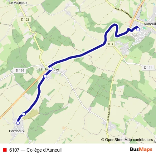 The first stop of the 6107 bus route is Auneuil - Collège and the last stop is Porcheux - Carrefour. 6107 (Collège d'Auneuil) is operational during entre semana.